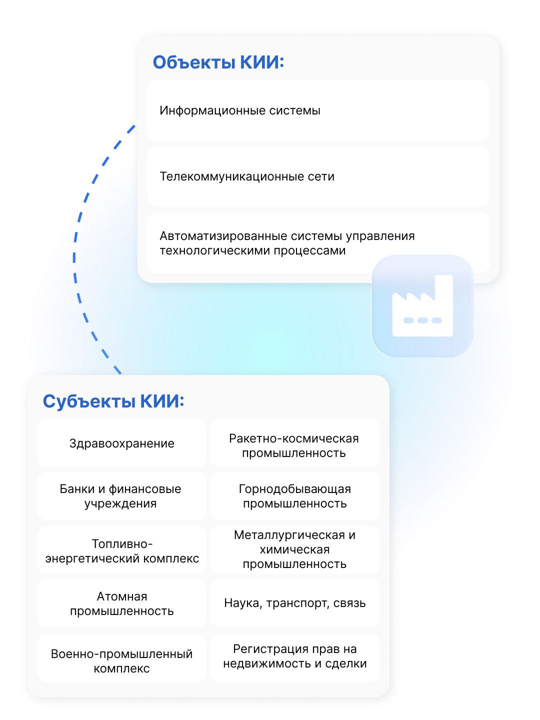 Официальное отнесение объектов вашей инфраструктуры к КИИ и выполнение строгих требований 187-ФЗ. Работаем с объектами, сбои в которых критичны для государства и общества.