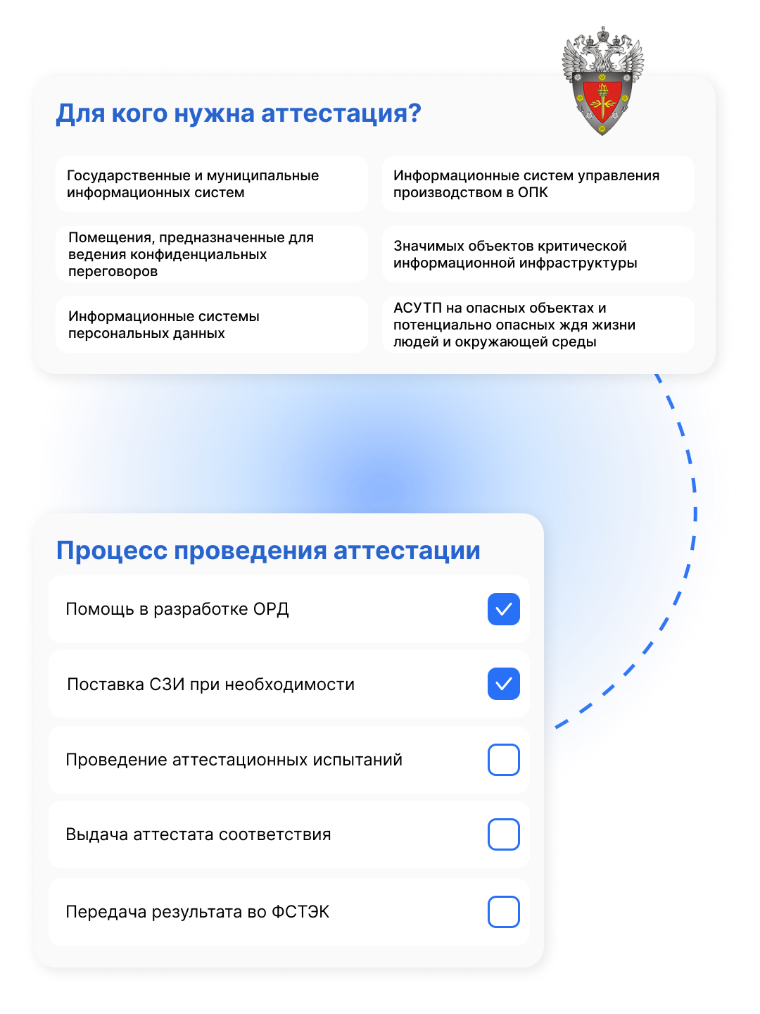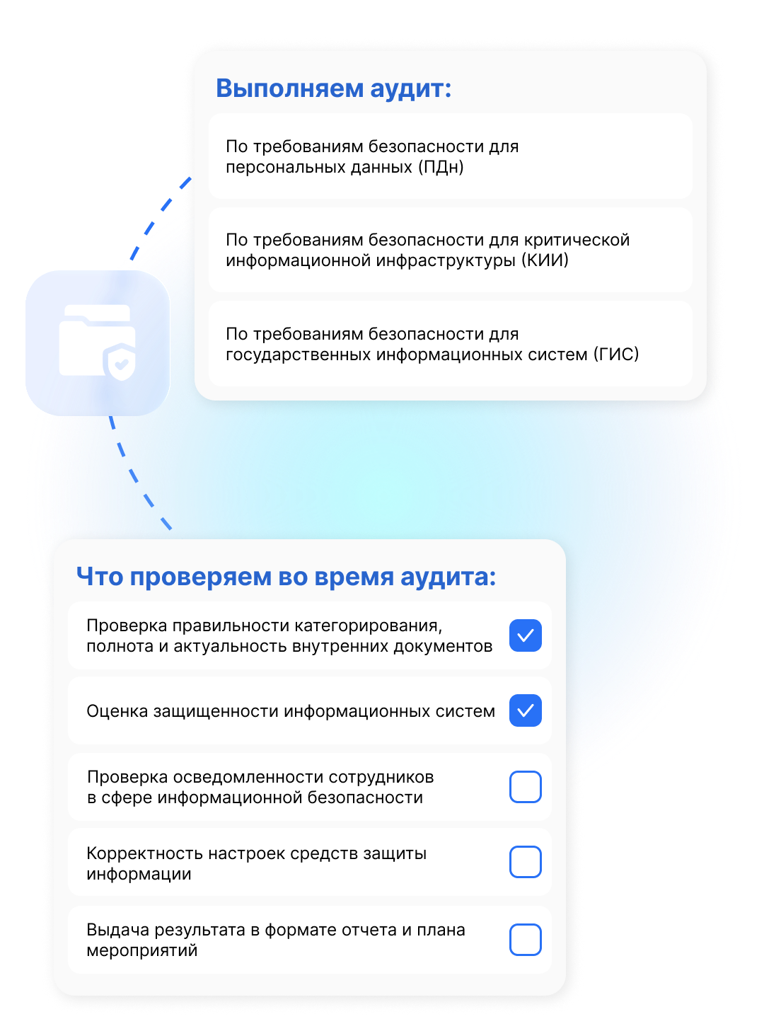 Гарантируем, что ваша система защиты остается эффективной, а аттестат — действительным. Ежегодные проверки, консультационная поддержка, помощь при изменениях в инфраструктуре и законодательстве.